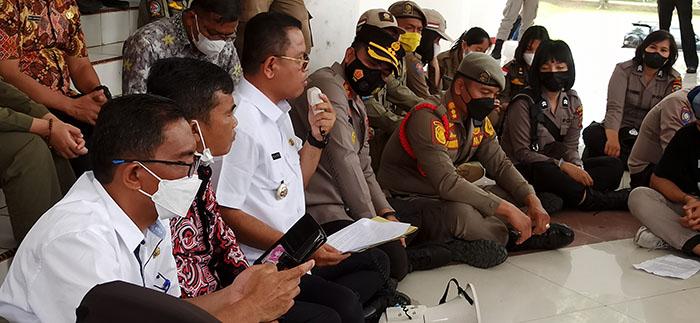 Bupati Poltak Sitorus pun duduk bersama pengunjuk rasa di teras kantor Bupati Toba.