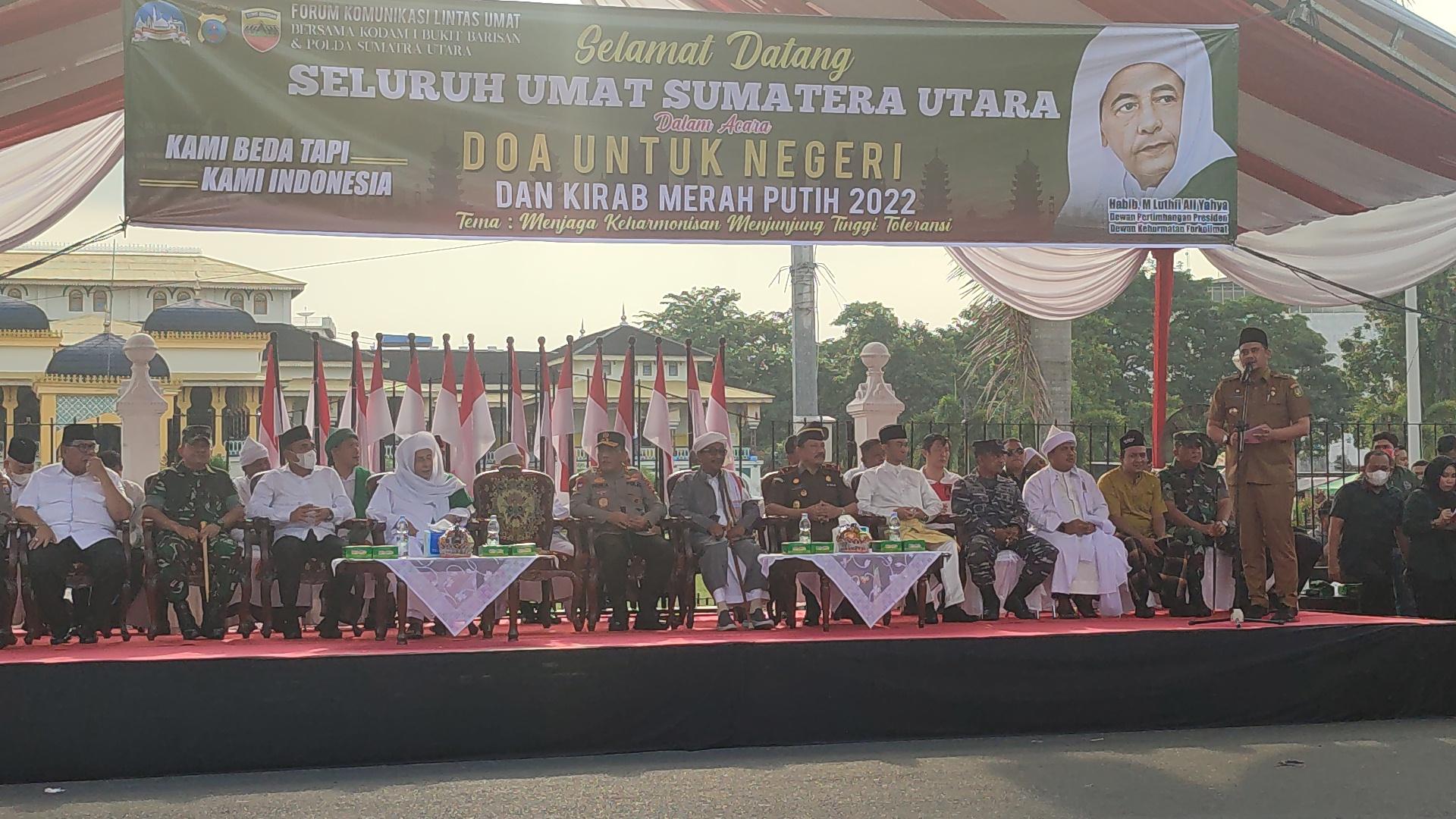 TRIBUN-MEDAN.com, MEDAN - Forum Komunikasi Lintas Umat (Forkolimat) menggelar kegiatan Doa Untuk Negeri dan Kirab Merah Putih di depan Istana Maimun, Selasa (13/8/2022).