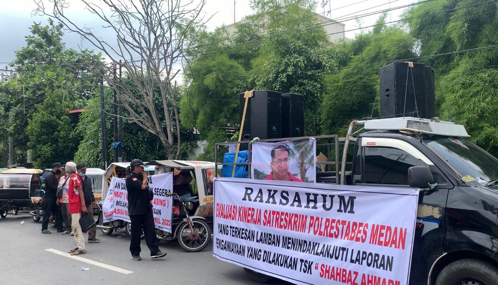 Dalam aksinya, massa yang datang ke Polrestabes Medan menumpangi becak motor dan membawa sejumlah poster.