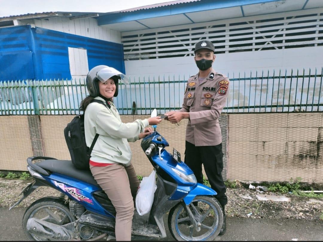 Personel Polsek Lahewa terus mengingatkan kepada masyarakat untuk senantiasa mengenakan masker saat beraktivitas diluar rumah.