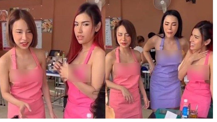 Pelayanan wanita ini jualan cuma pakau celemek. Akibatnya, area sensitif jadi bahan tontonan.