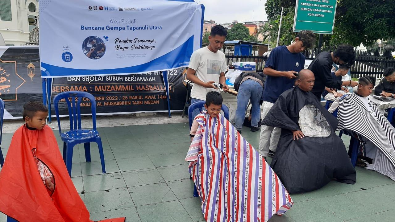 Human Initiative Sumatera Utara melakukan Aksi Peduli Bencana Gempa Tapanuli Utara dengan Layanan Pangkas Gratis di Pelataran Masjid Raya Medan