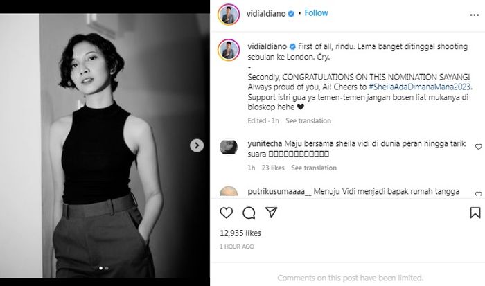"First of all (yang pertama dari semuanya), rindu. Lama banget ditinggal shooting sebulan ke London. Cry (nangis)," tulis Vidi.