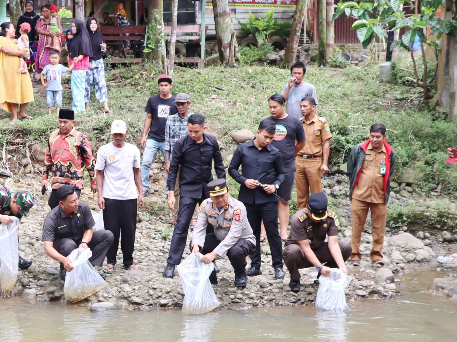 Kapolres Padangsidempuan AKBP Dwi Prasetyo Wibowo bersama Forkopimda, menabur ratusan bibit ikan mas dan nila di Sungai Lubuk Larangan di Kelurahan