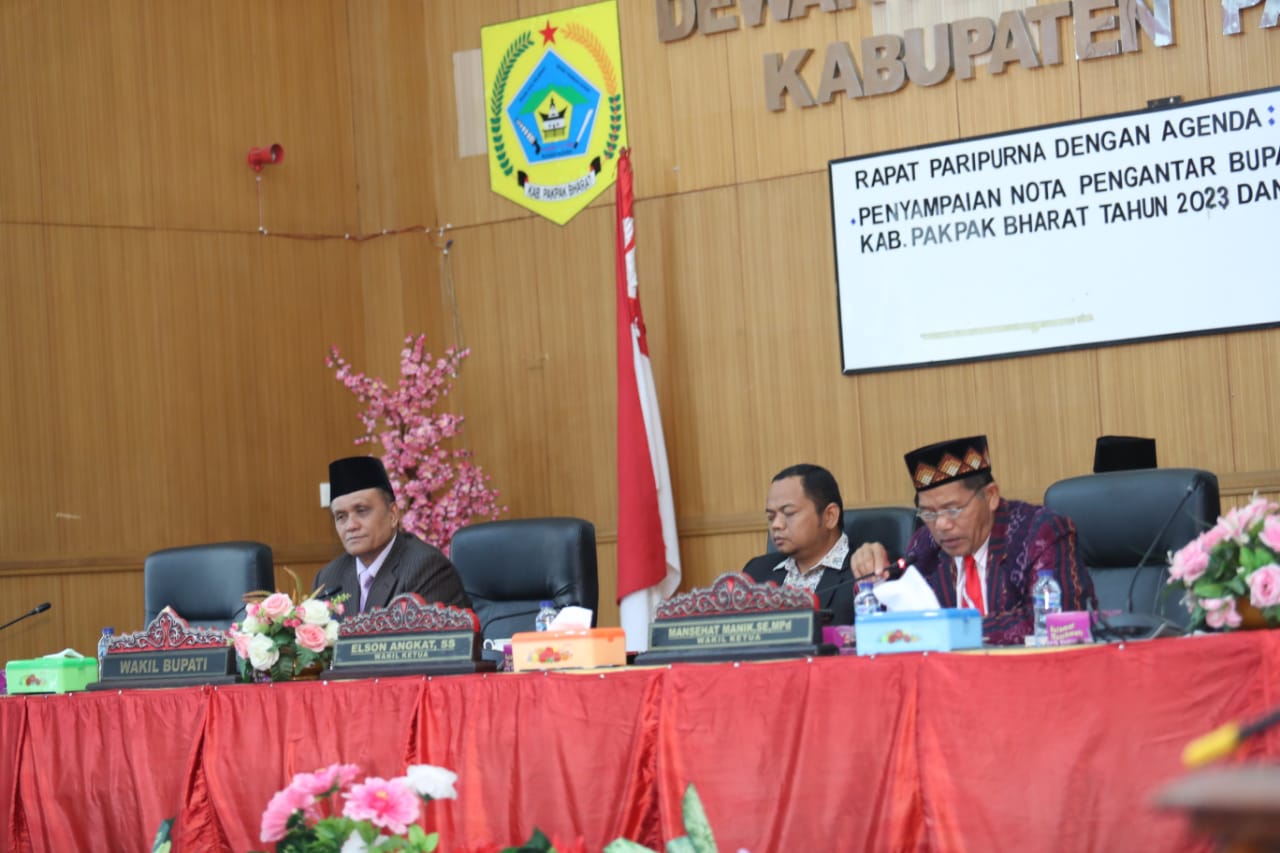 "Kita berharap semoga pokok Rancangan Peraturan Daerah Tentang Rancangan APBD Kabupaten Pakpak Bharat Tahun Anggaran 2023 ini mampu mencapai target sasaran dan indikator yang menjadi prioritas Pembangunan Tahun 2023, yang pada akhirnya memberi dampak terhadap perbaikan dan peningkatan kesejahteraan masyarakat melalui kerja keras, upaya yang sungguh-sungguh dan komitmen yang tinggi dari seluruh jajaran Pemerintah Kabupaten Bersama Legislative, serta didukung oleh seluruh komponen dan lapisan masyarakat," ucap Wakil Bupati, H Mutsyuhito Solin.