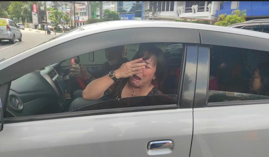 Seorang emak-emak, warga Kota Medan menangis-nangis karena tersasar saat mau melihat jenazah keluarganya di RS Murni Teguh Memorial Medan.