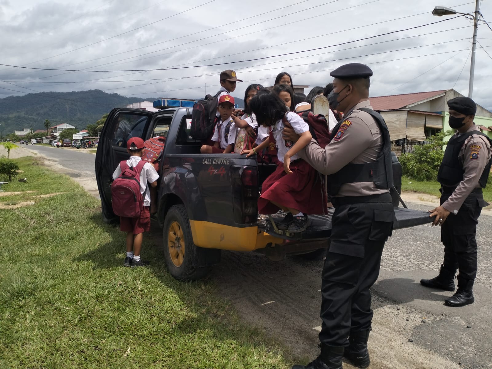 Personil Satuan Sabhara Polres Tapanuli Tengah juga memberikan tumpangan Gratis dan mengantar anak anak sekolah yang ada disekitar Aek Tolang Pandan,