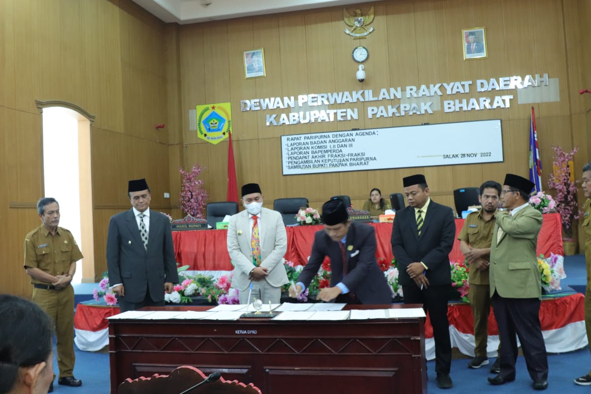 Dewan Perwakilan Rakyat Daerah (DPRD) Kabupaten Pakpak Bharat mengesahkan Anggaran Pendapatan Belanja Daerah (APBD) Pakpak Bharat Tahun Anggaran 2023.