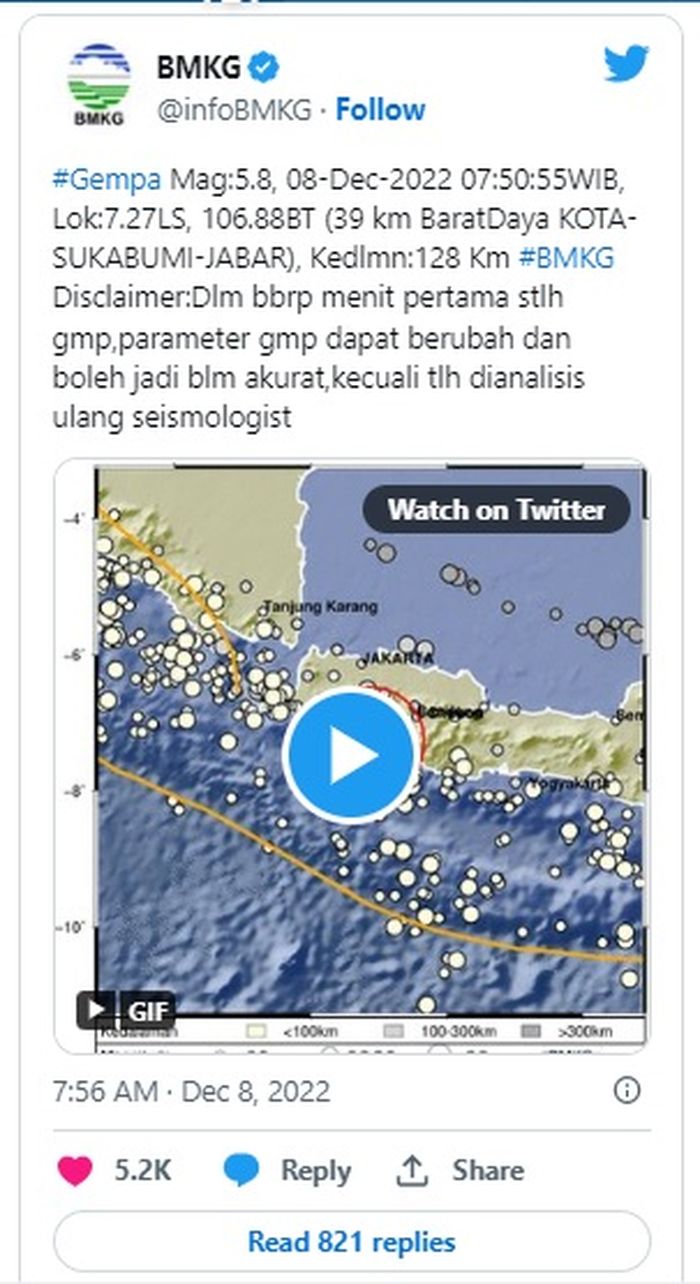 "Gempa Mag:5.8, 08-Des-22 07:50:57 WIB, Lok:7.11 LS,106.99 BT (22 km Tenggara KOTA-SUKABUMI-JABAR), Kedlmn:104 Km, tdk berpotensi tsunami #BMKG," jelas BMKG.