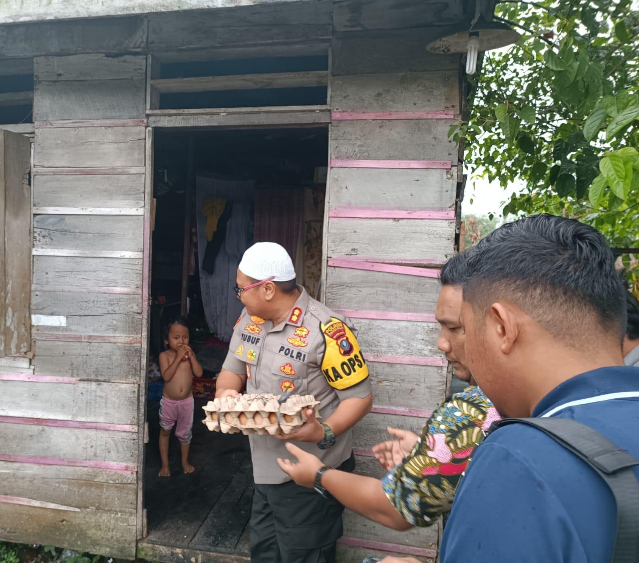 Dalam kesempatan tersebut, Kapolres menyerahkan bansos kepada Kesadaran Halawa berupa Ikan Sarden 5 Kaleng, Gula 2 Kg, Minyak goreng 2 Kg, Telur