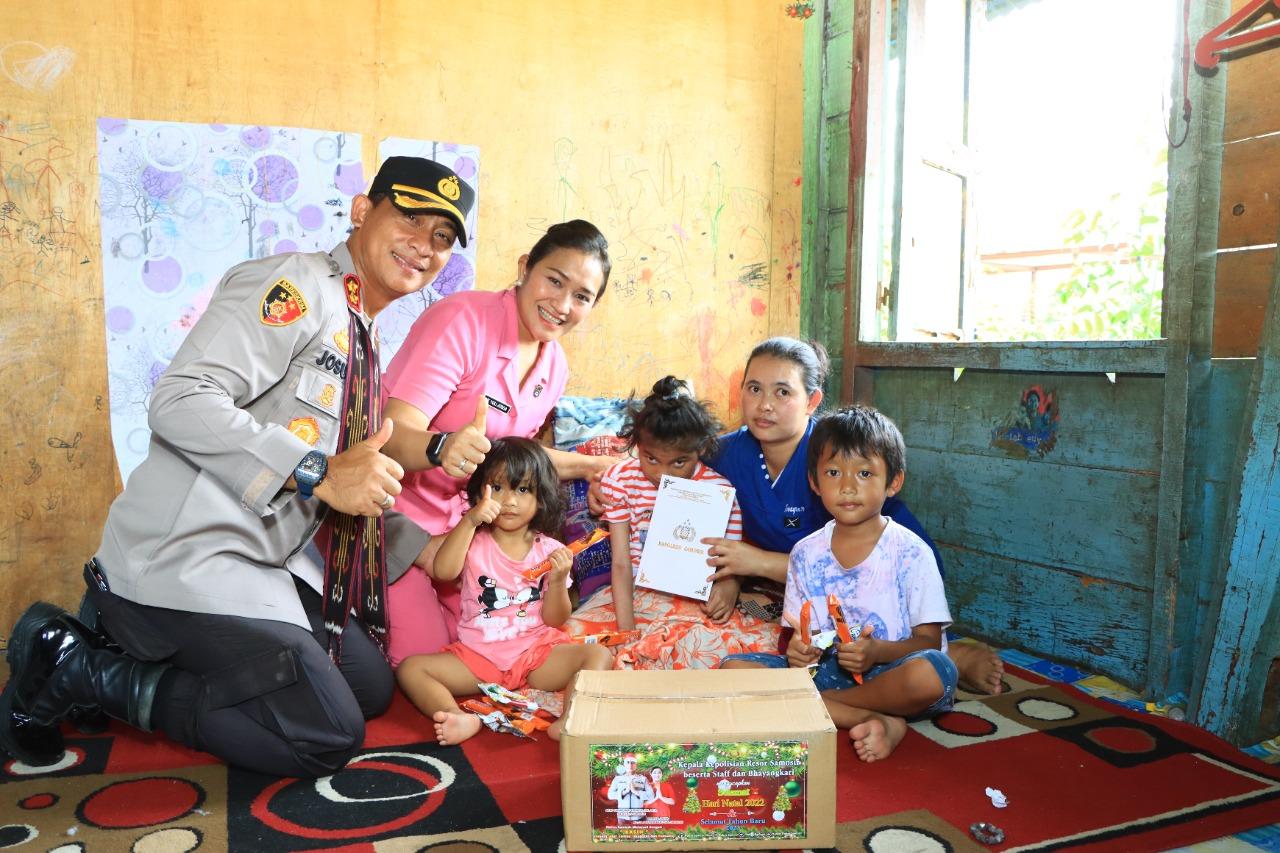 TRIBUN-MEDAN.com, SAMOSIR - Kapolres Samosir AKBP Josua Tampubolon didampingi Ny Yuli Josua Ketua Bhayangkari Cabang Samosir membagikan bingkisan natal kepada warga dan Kaum Difabel.