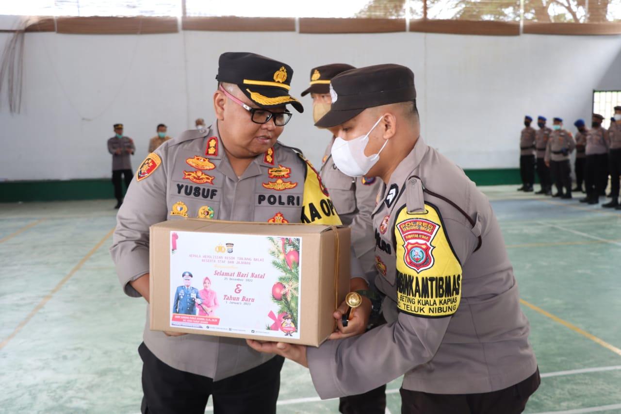 Kapolres Tanjungbalai AKBP Ahmad Yusuf Afandi membagikan bingkisan Natal dan tahun baru (Nataru) 2023 kepada personel, pendeta dan wartawan.