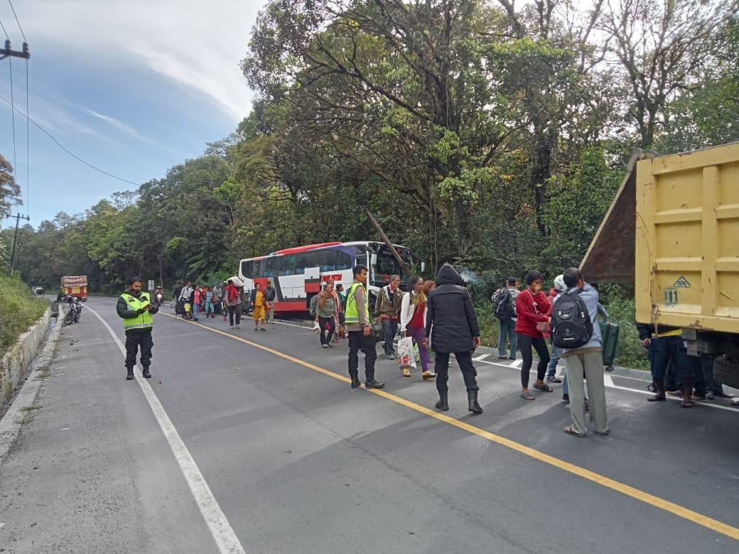 Kanit Gakkum Lantas Polres Dairi, Aipda Poltak Aritonang mengatakan, bus tersebut yang membawa 20 penumpang terpaksa membanting setir ke arah Hutan Lae Pondom untuk menghindarkan kecelakaan.