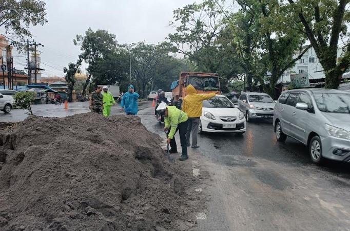 "Saat ini kita sedang mengevakuasi truk dan mengurai kemacetan akibat tumpukan pasir yang tumpah dari truk yang terguling ini," Kata Ipda Herbet.