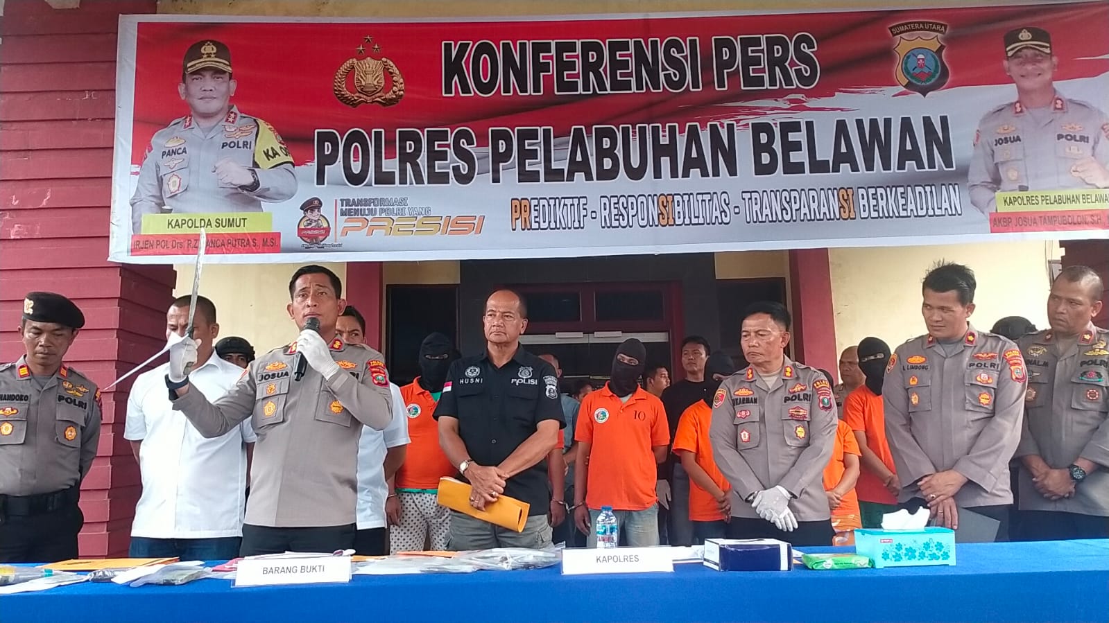 TRIBUN-MEDAN.COM, BELAWAN –“Saya sudah sampaikan, perang terhadap narkoba. Tidaka ada tanggung-tanggun, Kalau tangkap pengguna, tangkap pengedar, tangkap bandarnya. Tiga hari lalu kita juga sudah menangkap. Hari ini kita juga menangkap 7 tersangka , diantaranya 5 laki-laki dan dua orang perempuan,” kata Kapolres Pelabuhan Belawan AKBP Josua di Mapolres Pelabuhan Belawan Rabu (24/1/2023) ketika hendak memulai temu pers terkait pengungkapan dan penangkapan bandar narkoba.