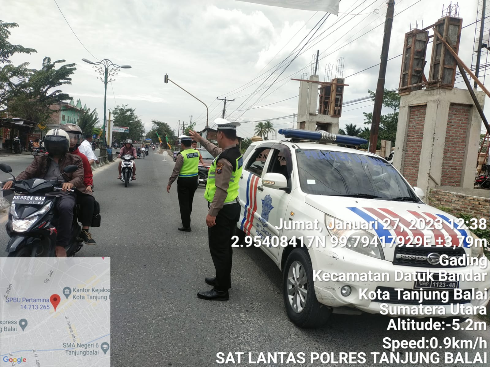 Personil sat lantas polres Tanjung balai melaksanakan giat pengaturan arus lalulintas di sekitar wilayah lokadi mesjid kota Tanjungbalai pada saat