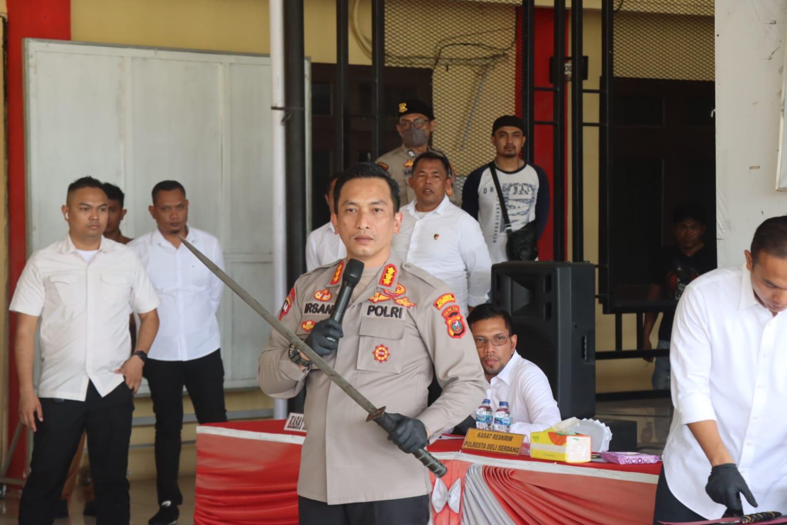 Kapolresta Deliserdang Kombes Pol Irsan Sinuhaji saat paparan menceritakan pada Sabtu (28/1/2023), personel Polresta Deliserdang mengamankan pelaku geng motor sebanyak 58 orang dari berbagai titik di wilayah hukum Polresta Deliserdang.