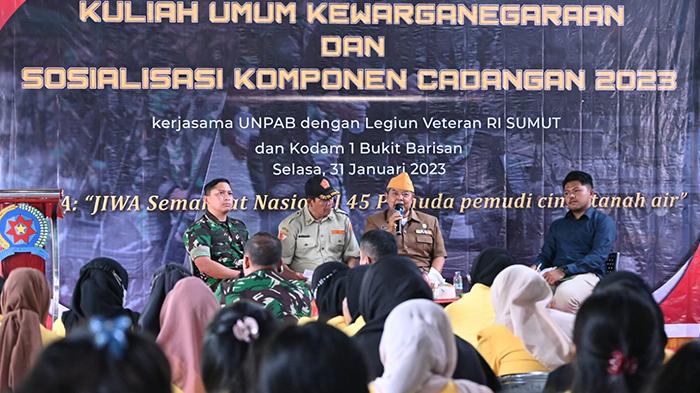 TRIBUN-MEDAN.com, MEDAN - UNPAB laksanakan kuliah umum kewarganegaraan dan sosialisasi komponen cadangan 2023 dengan tema, “Jiwa Semangat Nasional 45 Pemuda Pemudi Cinta Tanah Air”, yang bekerjasama dengan Legiun Veteran RI Sumut dan Kodam 1 Bukit Barisan pada selasa, (31/01/2023) di Gelanggang Mahabento UNPAB.
