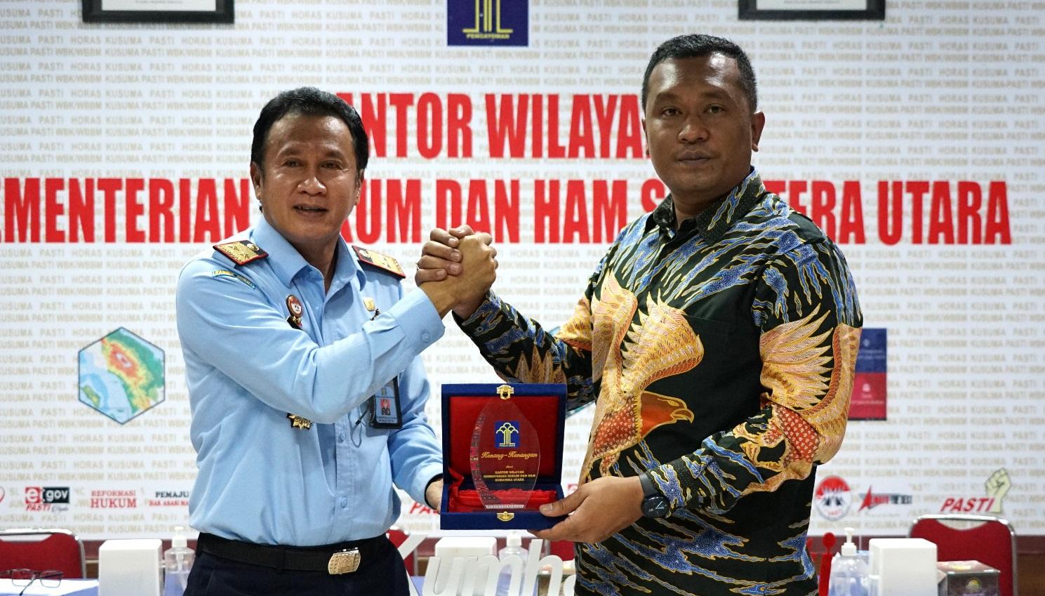 Kakanwil Kumham Sumut Imam Suyudi di dampingi Kepala Bidang Hukum Bintang Napitupulu menyambut Rombongan DPRD Kabupaten Toba yang dipimpin oleh Efendi Sintong P. Napitupulu di Ruang Saharjo Kanwil Kemenkuham Sumut.