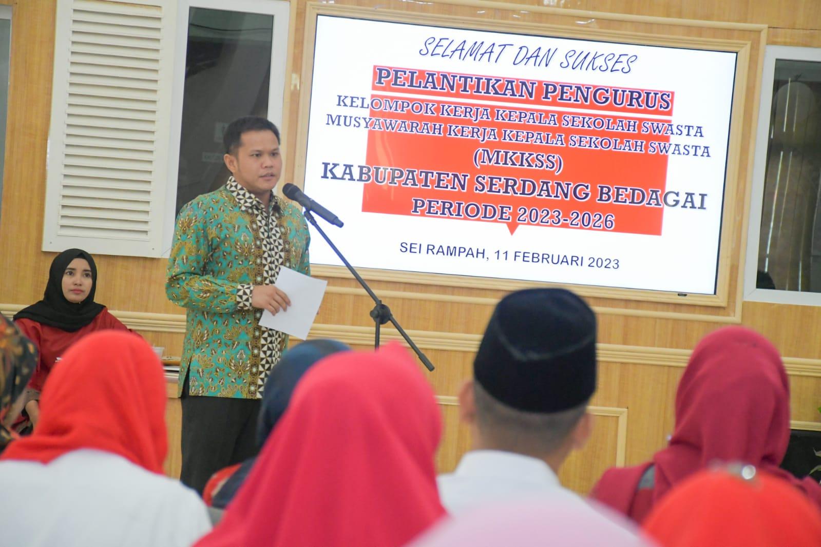 Wabup Sergai dalam sambutannya menyampaikan selamat bagi para kepala sekolah swasta yang telah dilantik mennjadi pengurus MKKS SMP Swasta dan K3S SD Swasta di Kabupaten Sergai.