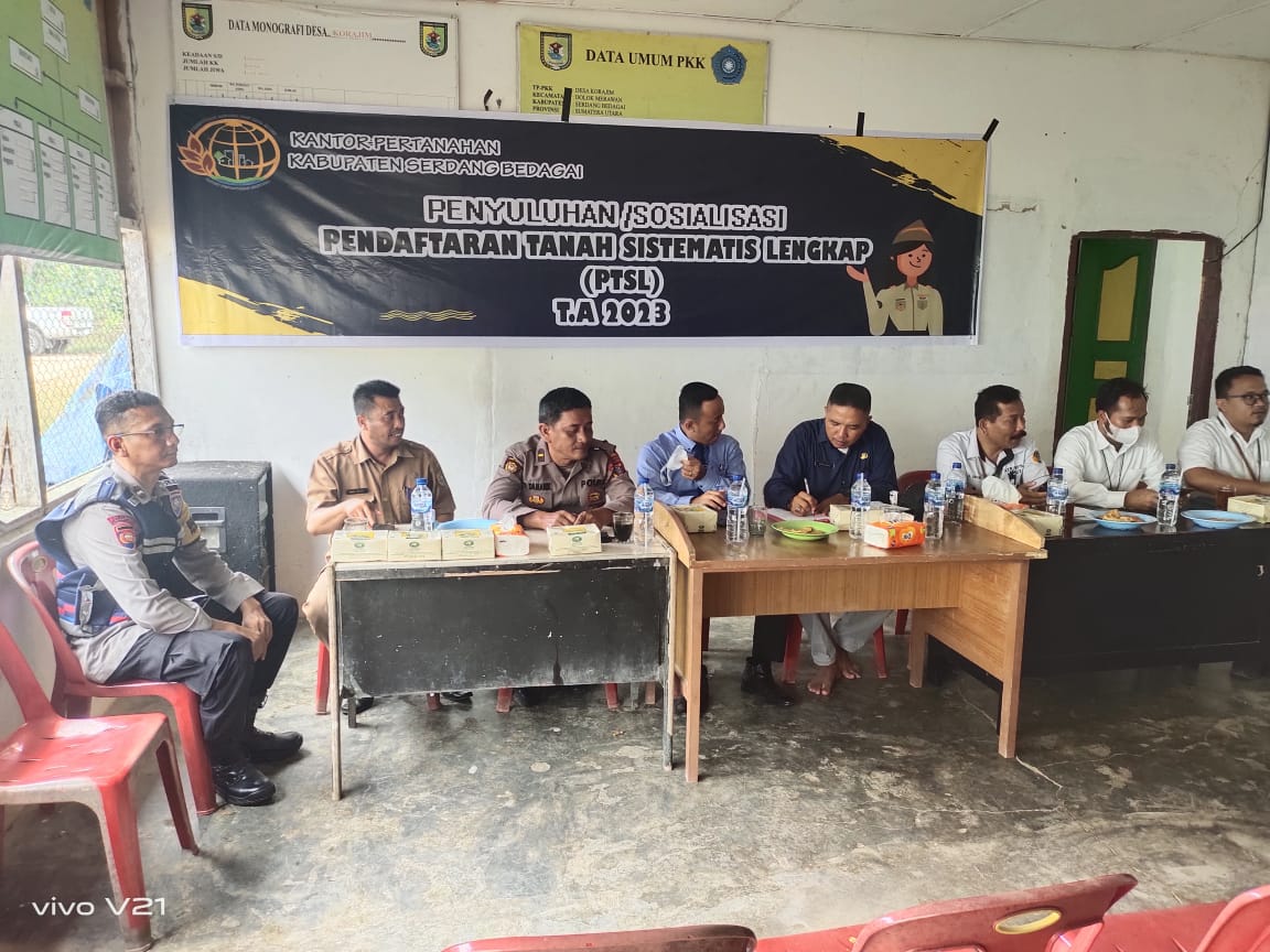 TRIBUN-MEDAN.COM, TEBING TINGGI -Kapolsek Dolok Merawan Resor Tebing Tinggi AKP Pinem SH diwakili Waka Polsek Ipda TP Damanik dan Bhabinkamtibmas Aipda Tri OS memberi penyuluhan sosialisasi Pendaftaran Tanah Sistematis Lengkap (PTSL) 2023 di kantor Desa Korajim Kecamatan Dolok Merawan Kabupaten Serdang Bedagai yang termasuk wilayah hukum Polres Tebing Tinggi, Selasa (14/2/2023).