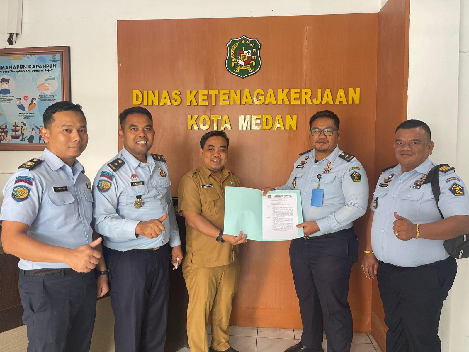 TRIBUN-MEDAN.com, MEDAN - Kabar gembira menghampiri Lembaga Pemasyarakatan Kelas I Medan, Senin (20/2/2023). Kepala Lembaga Pemasyarakatan Kelas I Medan, Maju A. Siburian melalui Kabid Kegiatan Kerja, Eben H. Depari menerima tanda daftar Lembaga Pelatihan Kerja (LPK) dari Kepala Dinas Ketenagakerjaan Pemerintah Kota Medan, Ilyan Chandra Simbolon, bertempat di Disnaker Kota Medan.