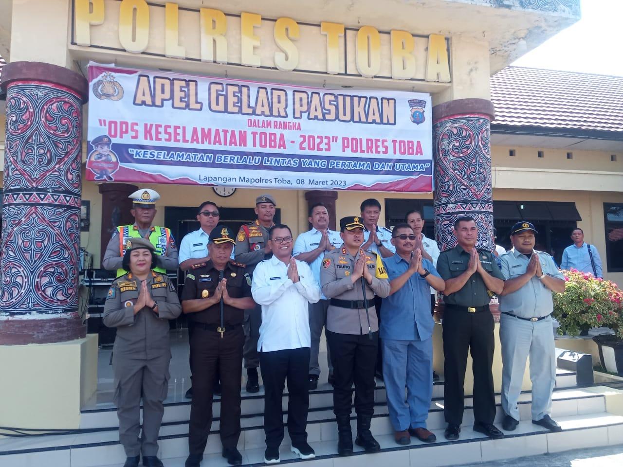 TRIBUN-MEDAN.COM, TOBA -Kapolres Toba AKBP Taufiq Hidayat Thayeb SH SIK memimpin Apel Gelar Pasukan Operasi Keselamatan Toba 2023 di Halaman Mapolres Toba, Rabu (08/03/2023) dihadiri Bupati Toba Ir Poltak Sitorus.