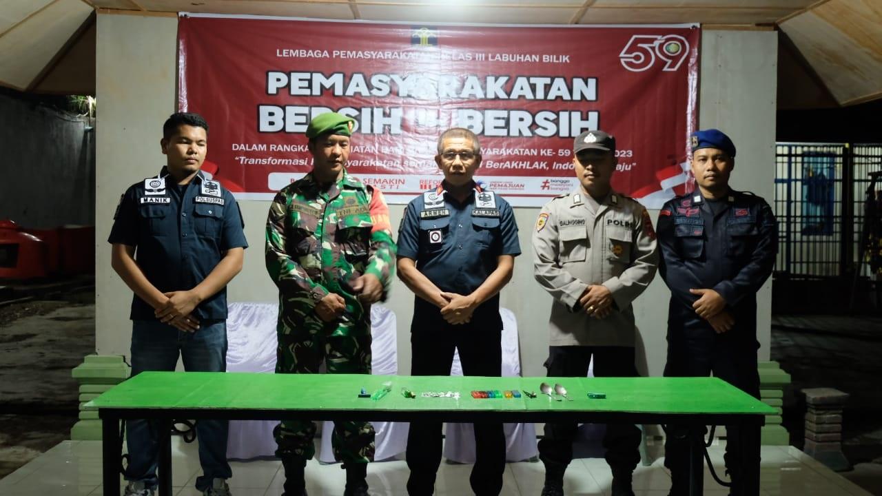 TRIBUN-MEDAN.COM, LABUHAN BILIK - Sambut Hari Bakti Pemasyarakatan ke-59 Lembaga Pemasyarakatan (Lapas) Labuhan Bilik gelar Razia gabungan bersama Aparat Penegak Hukum (APH), Polsek Panai Tengah dan Koramil 04/LB, Jumat (17/03/2023).