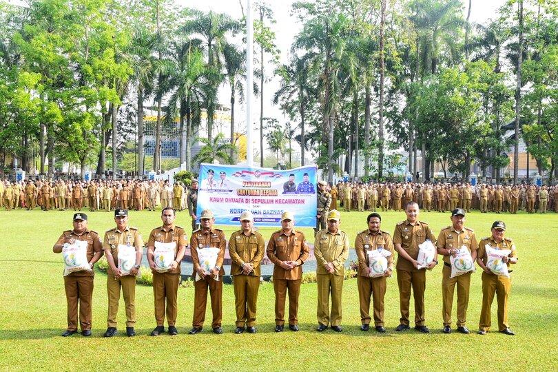Di sela-sela apel, Sekda menyerahkan 500 karung beras kepada 10 camat.