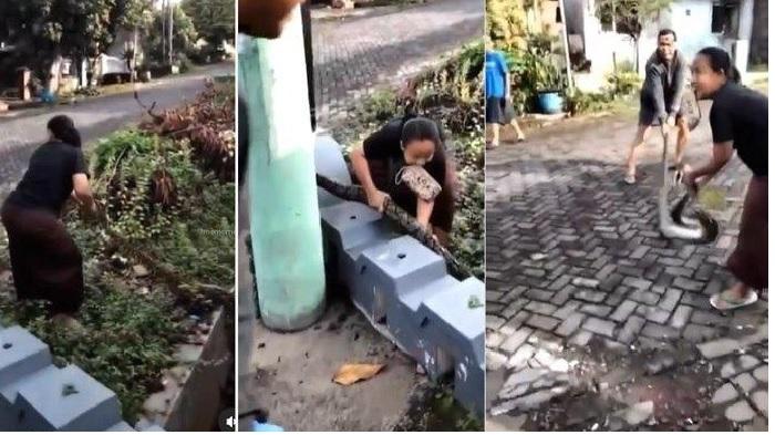 Niat Selamatkan Kucing, Emak-emak Tangan Kosong Tangkap Ular, Pria Di Sampingnya Kalang Kabut