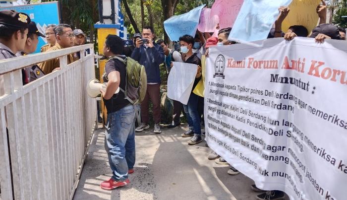 TRIBUN-MEDAN.COM,DELISERDANG- Puluhan pendemo dari Forum Anti Korupsi (Forak) mendesak Bupati Deliserdang, Ashari Tambunan mencopot Kepala Dinas Pendidikan Deliserdang.