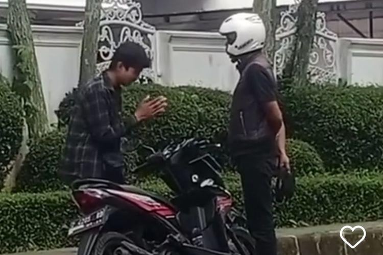 Awalnya tampak seorang pemuda pengendara motor Beat mencoba mencium tangan pengendara berhelm putih yang mengendarai motor Mio.