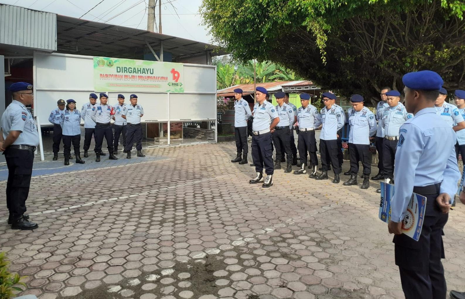 Giat rutin apel pagi bersama pegawai Lapas Kelas IIA Rantauprapat diikuti oleh pejabat struktural dan staf di lapangan parkir Lapas