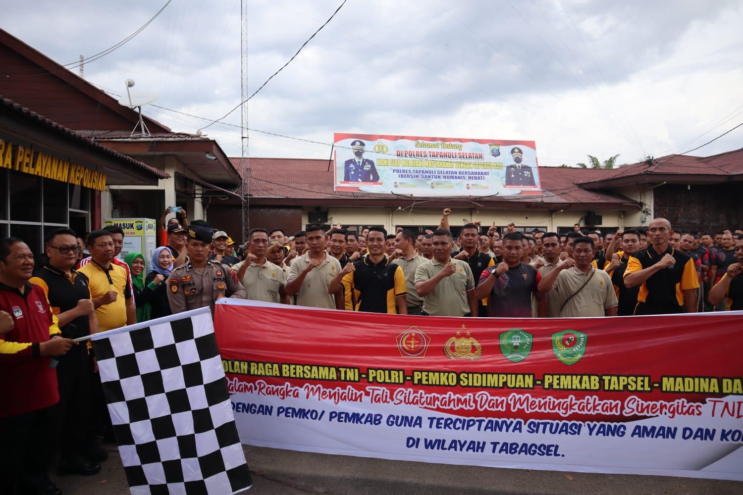 empererat sinergitas TNI-Polri, Kapolres Padang Lawas AKBP Indra Yanbnira Irawan SIK MSi mengikuti olah raga bersama TNI Polri dan Forum Komunikasi