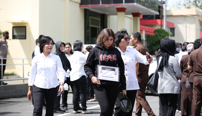 TRIBUN-MEDAN.COM,MEDAN- Polisi menghadirkan Savira Husna, teman dekat Ken Admiral dalam rekonstruksi kasus penganiyaan yang dilakukan anak AKBP Achiruddin Hasibuan, Aditya Hasibuan di Polda Sumut, Senin (8/5/2023).