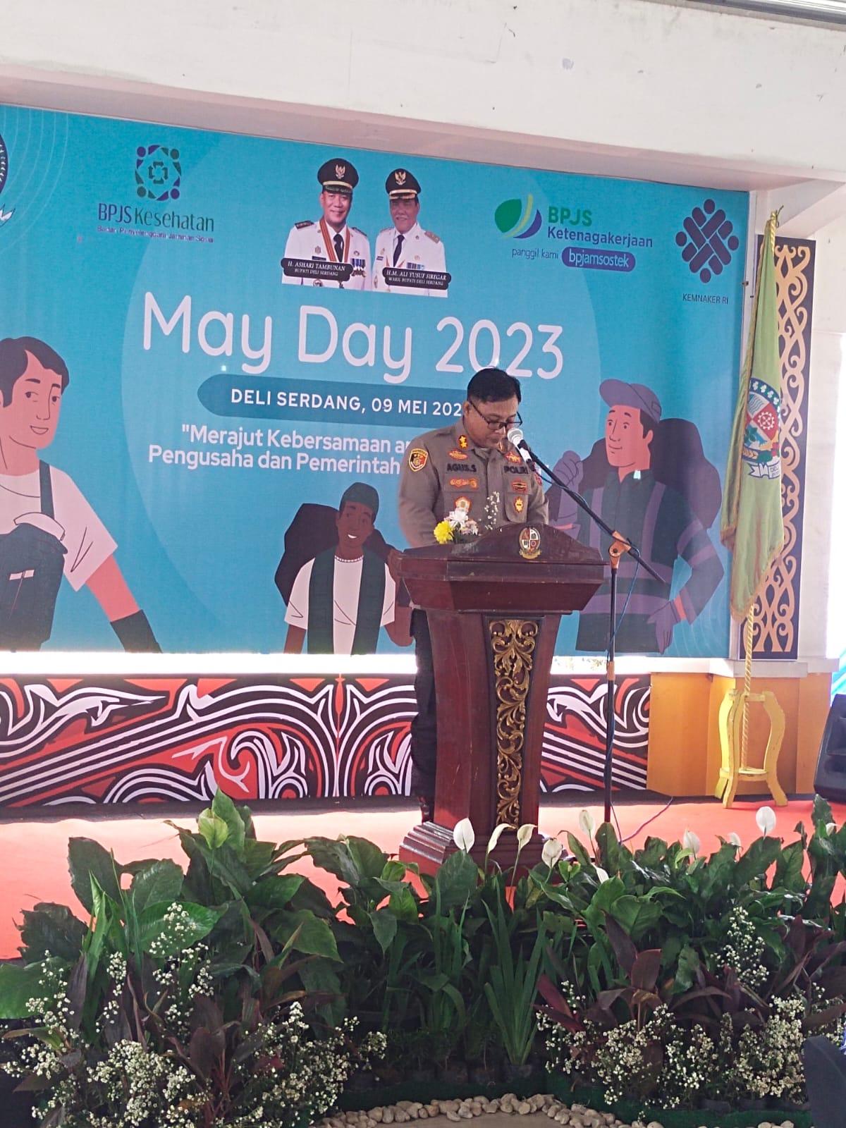 Wakapolresta Deliserdang AKBP Agus Sugiyarso mengajak seluruh pekerja, pengusaha dan pemerintah untuk saling berkerja sama dalam meningkatkan kesejahteraan masyarakat khususnya seluruh Serikat Pekerja maupun Serikat buruh di Wilayah Kabupaten Deliserdang.