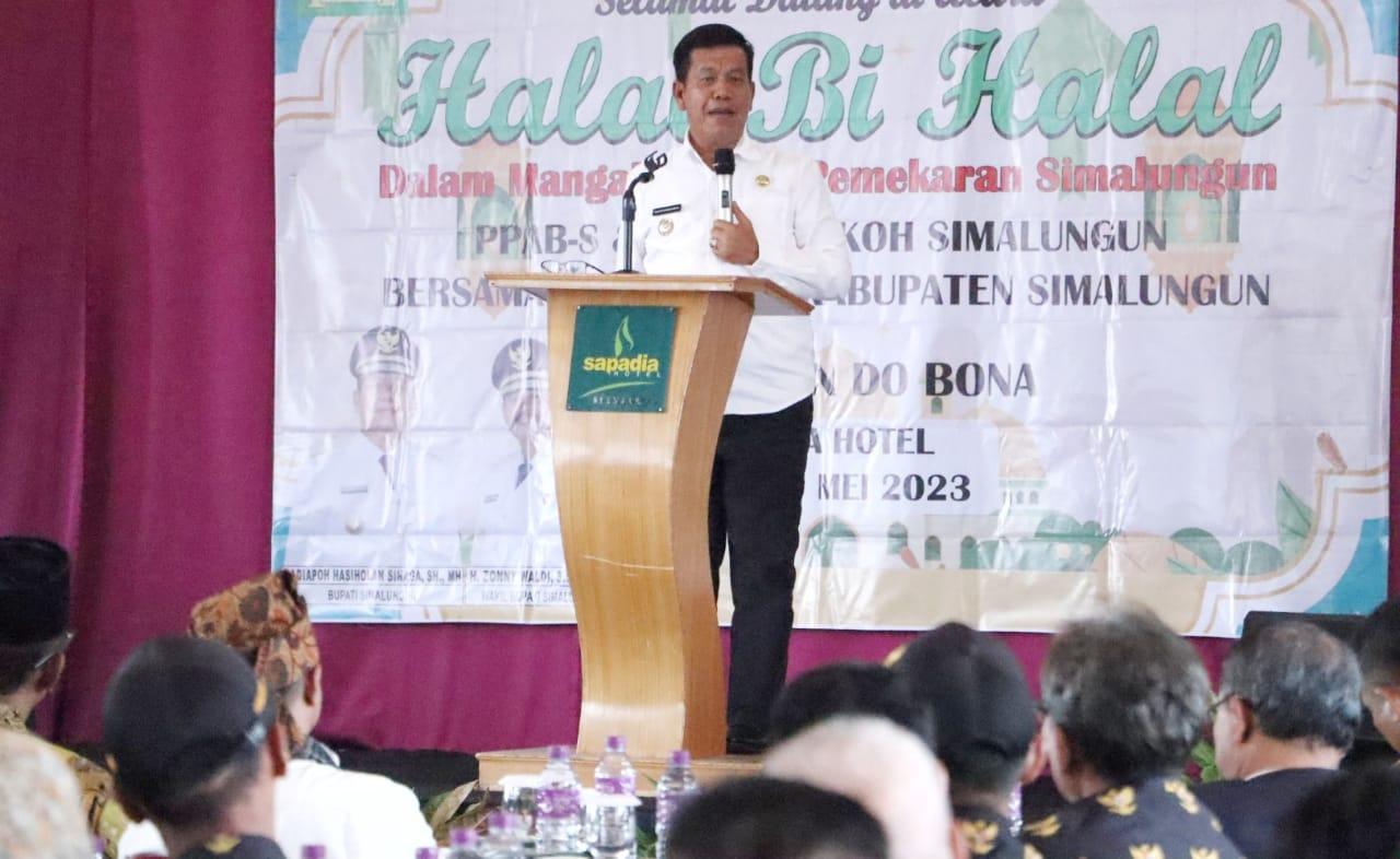 TRIBUN-MEDAN.com, SIMALUNGUN - Bupati Simalungun Radiapoh Hasiholan Sinaga dan Wakil Bupati H Zonny Waldi menghadiri acara Halal Bihalal dalam Mangalop Riah Pemekaran Simalungun, Kamis (11/5/2023).