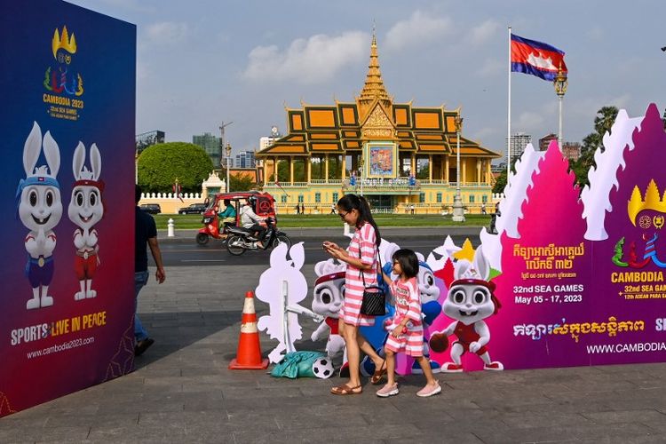 Seorang wanita dan anaknya berjalan di dekat papan yang menunjukkan maskot SEA Games 2023 menjelang opening ceremony atau upacara pembukaan di Stadion Modorok Techo, Phnom Penh, Kamboja, Kamis (4/5/2023). Artikel ini berisi jadwal siaran langsung opening ceremony SEA Games 2023 Kamboja. (Photo by TANG CHHIN Sothy / AFP)(AFP/TANG CHHIN SOTHY)