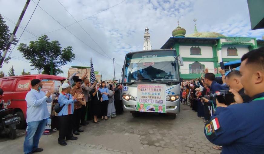 Sebanyak 59 orang calon jemaah haji asal Kabupaten Karo diberangkatkan ke Asrama Haji, Kota Medan, Kamis (25/5/2023).