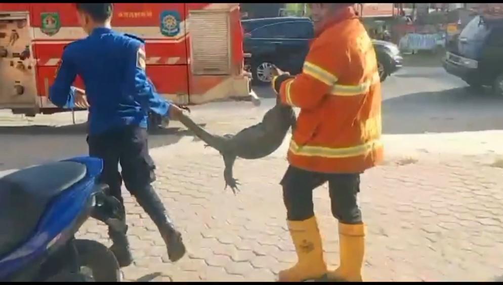 Katanya, dalam evakuasi tersebut kaki salah seorang petugas nyaris terkena gigitan biawak yang berukuran besar tersebut.