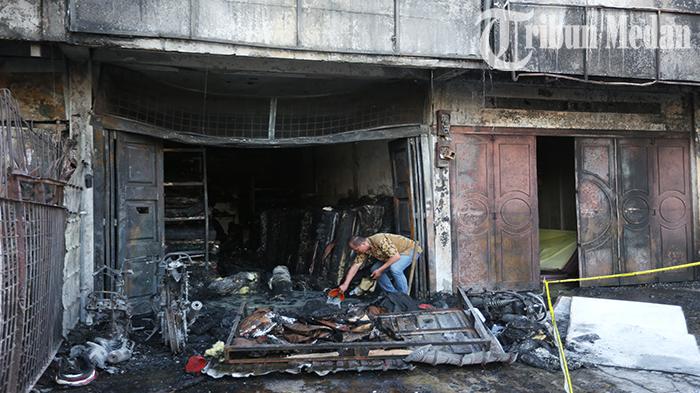 | Tim Inafis Polrestabes Lakukan Olah TKP Empat Ruko yang Terbakar di Jalan Krakatau Medan |