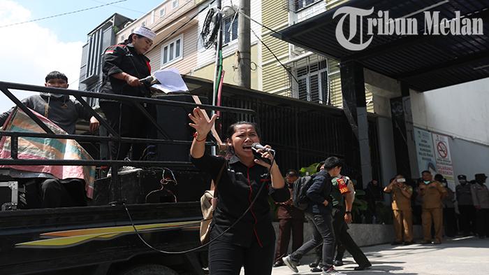 TRIBUN-MEDAN.com, MEDAN - Sejumlah mahasiswa yang tergabung dalam Gerakan Mahasiswa Nasional Indonesia (GMNI), melakukan demonstrasi di depan Universitas Prima Indonesia (Unpri) Jalan Sampul, No 4, Sei Putih Barat Medan, Selasa (20/6/2023).