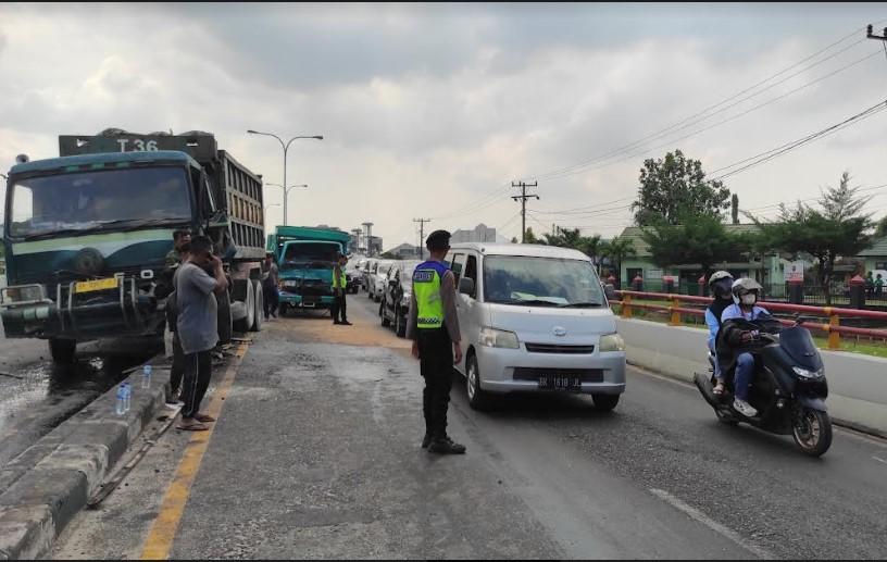 Kecelakaan lalu lintas terjadi antara truk pengangkut batu koral pecah dan truk pengangkut batu bata di Fly over Amplas