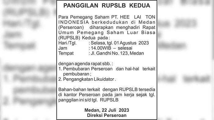 TRIBUN-MEDAN.com, MEDAN - Para pemegang saham PT HEE LAI TON INDONESIA berkedudukan di Medan (Perseroan) diharapkan menghadiri Rapat Umum Pemegang Saham Luar Biasa (RUPSLB) kedua pada :