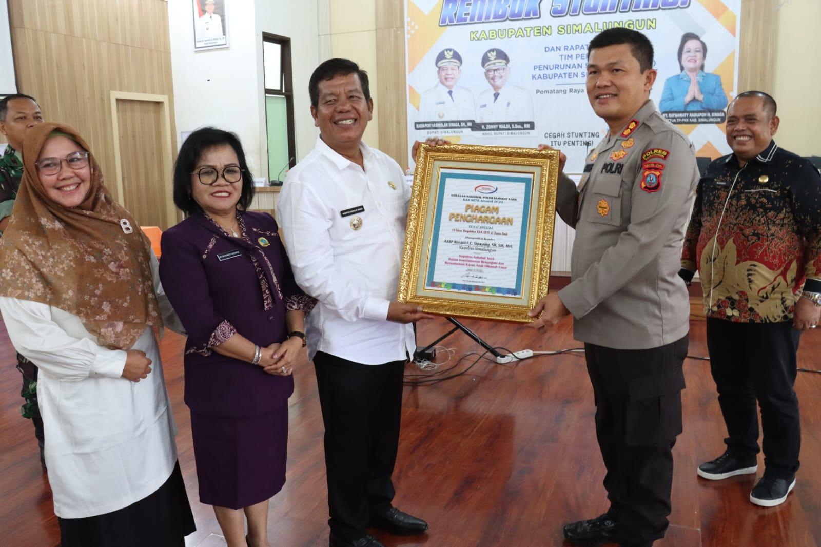 Bupati Simalungun, Radiapoh Hasiholan Sinaga menyampaikan apresiasi dan memberikan Piagam Penghargaan atas dedikasi dan kerja keras Polres Simalungun dalam mendukung upaya penurunan angka stunting di Kabupaten Simalungun.