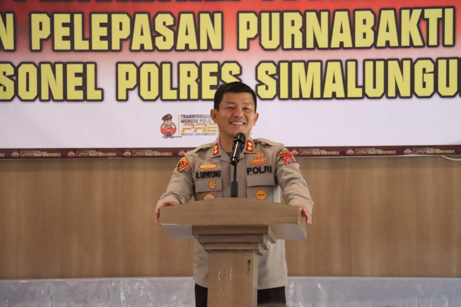 Kapolres Simalungun, AKBP Ronald FC Sipayung memimpin upacara pelaksanaan pengantar tugas dan pelepasan purnabakti personel Polres Simalungun di Aula