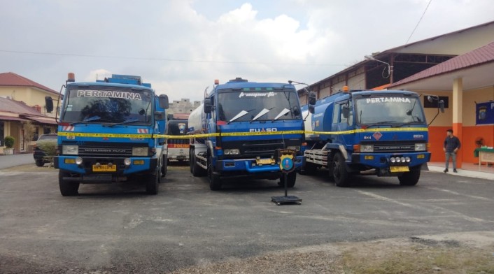 Petugas Polres Tanjungbalai mengamankan tiga truk bertuliskan Pertamina karena diduga hendak mencurangi penyaluran BBM subsidi