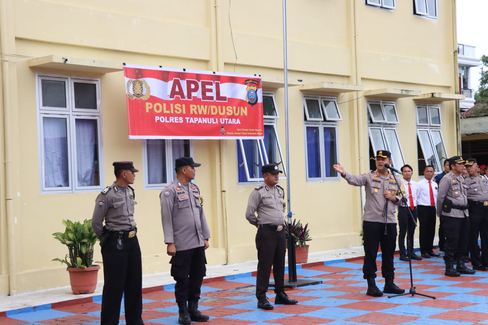 TRIBUN-MEDAN.COM, TAPANULI UTARA-Polres Tapanuli Utara Polda Sumut gelar apel pasukan dalam rangka launching Polisi RW/ Dusun di halaman Mapolres Taput, Senin (21/8/2023).