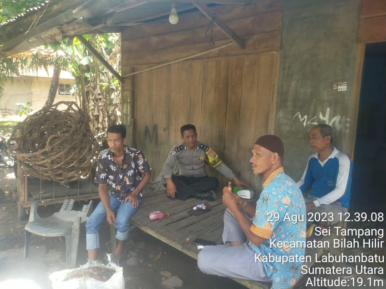 TRIBUN-MEDAN.com, LABUHANBATU - Personel Bhabinkamtibmas Desa Emplasmen, Kecamatan Bilah Hulu, Kabupaten Labuhabatu, Aipda AH Saragih melaksanakan kegiatan sambang dengan warga di Emplasmen, Dusun Pondok Kroyok, Selasa (29/8/2023).