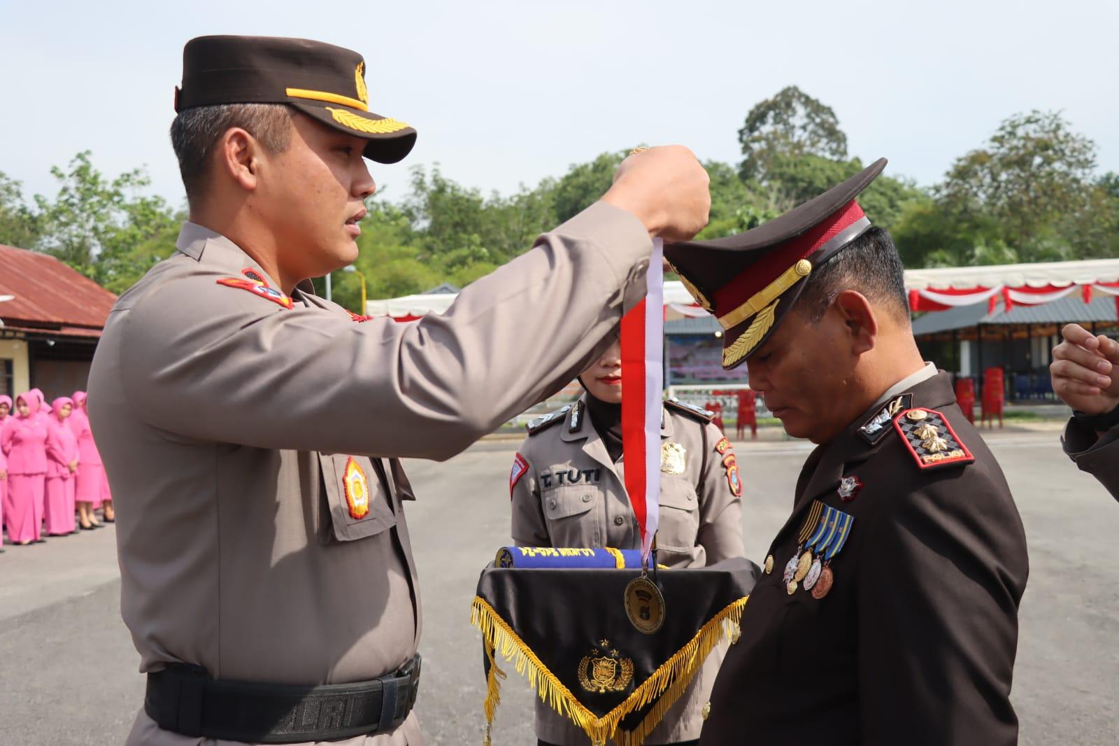 Kapolres Mandailing Natal (Madina) AKBP H M Reza Chairul Akbar Siddiq memimpin langsung pelaksanaan upacara pelepasan purna bakti AKBP Walder Sidabuta
